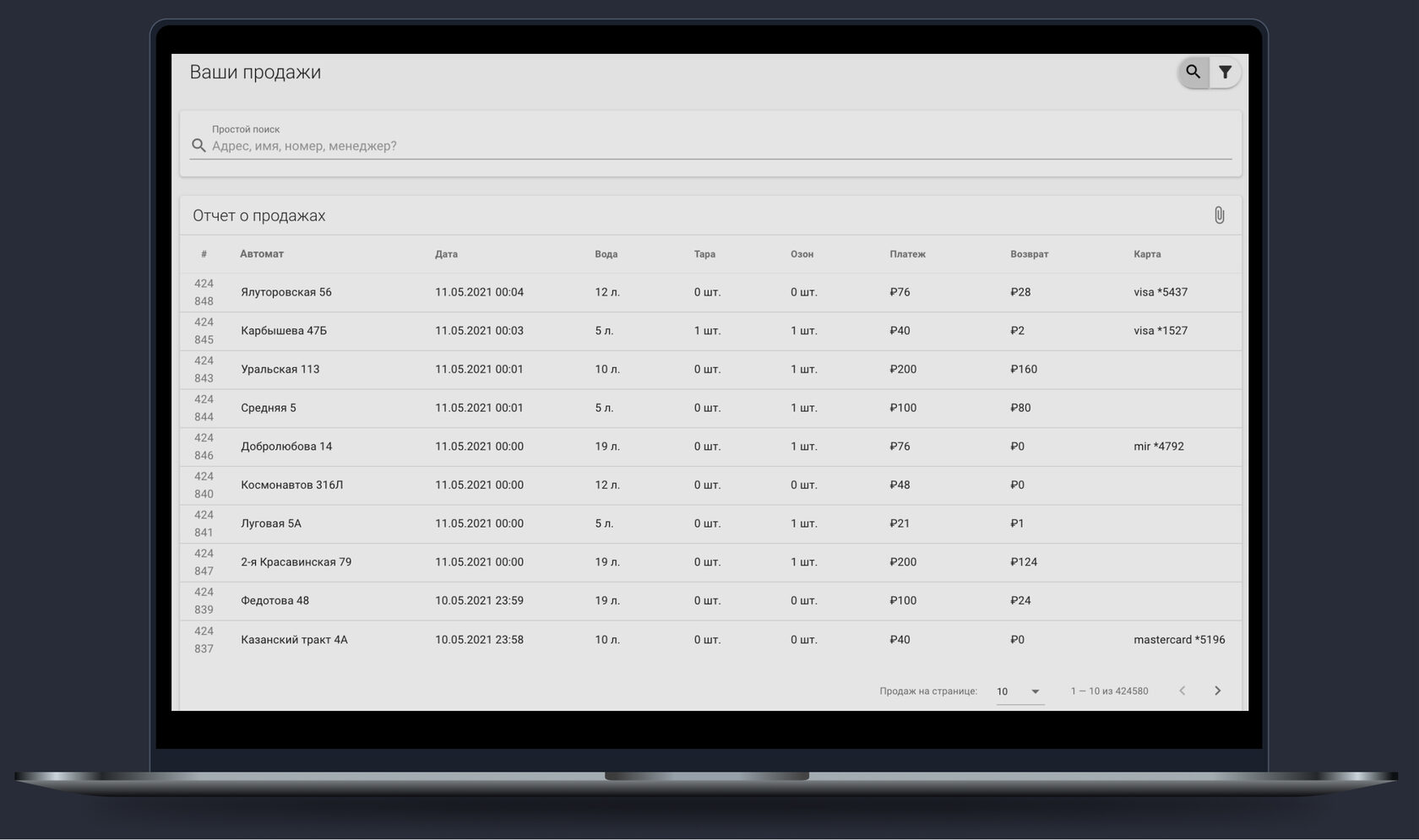 Статистика работы аппарата и результаты по каждой точке продаж. Цены, регулировки, блокировка, перезагрузка.